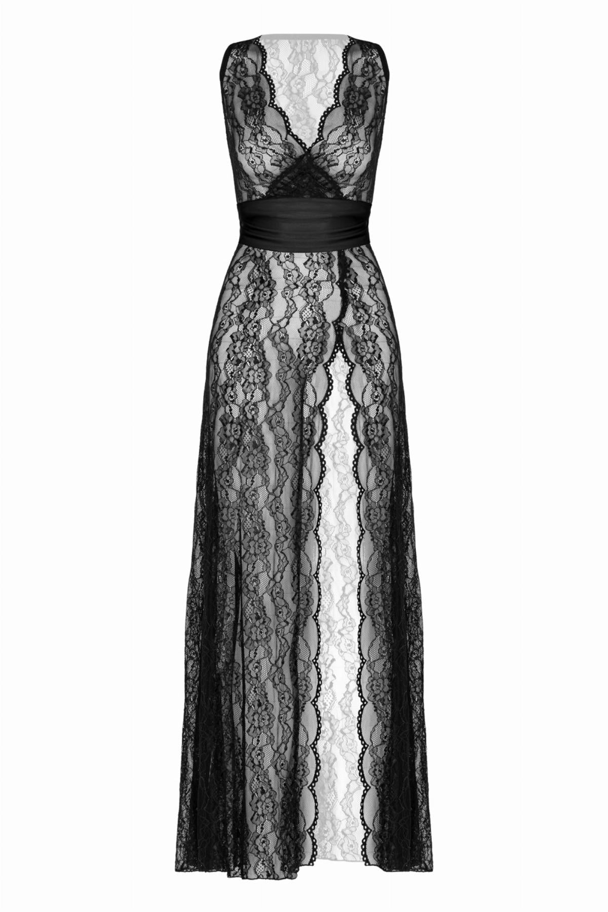 Crafted from stretchy ribbed lace, this long, body-hugging dress features a daring front slit for a bold, feminine silhouette. Whether worn as a statement evening dress or a seductive piece for private moments, it’s made to impress.