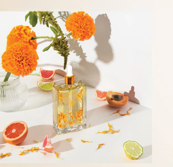 A golden-hued oil with delicate marigold petals, beautifully housed in a jewel-like glass bottle. The elegant dropper makes each application a unique, personal ritual.