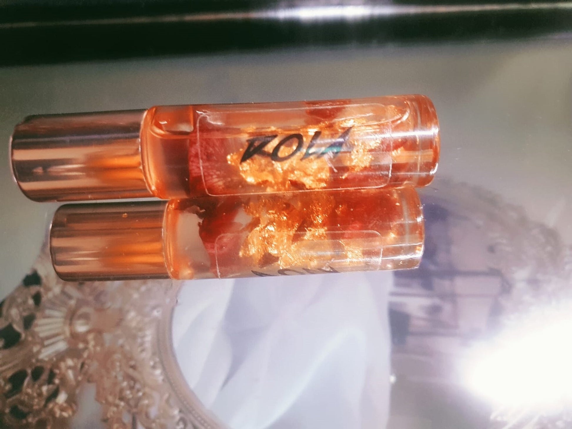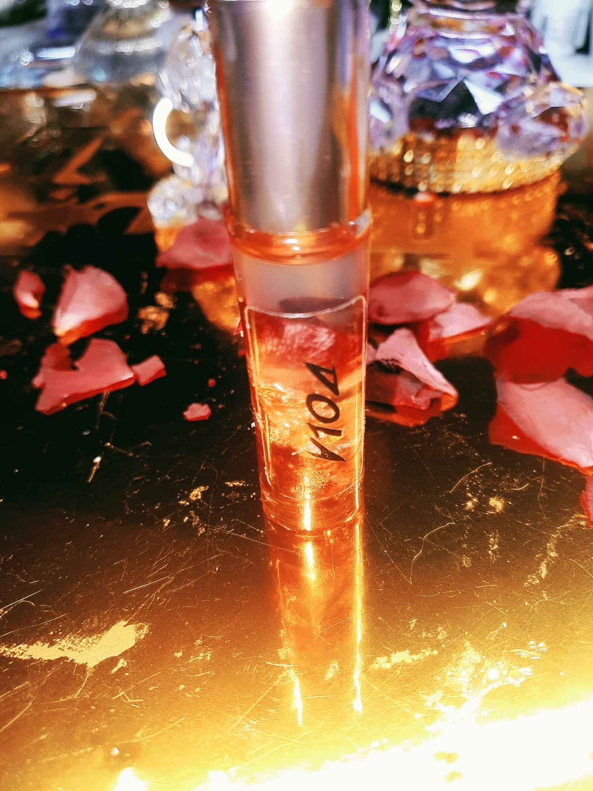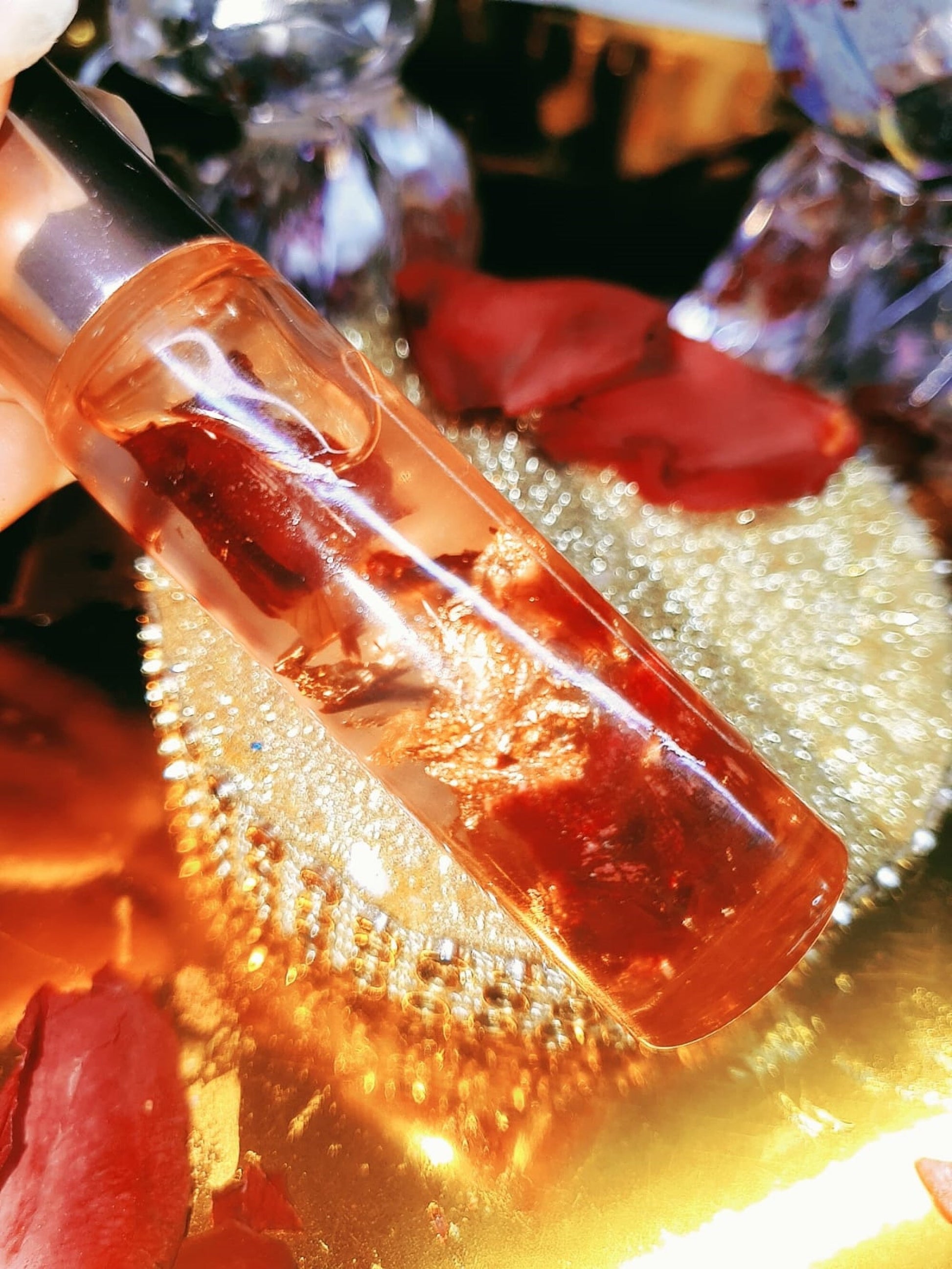 This Lip Oil contains dry rose petals and gold sheets.