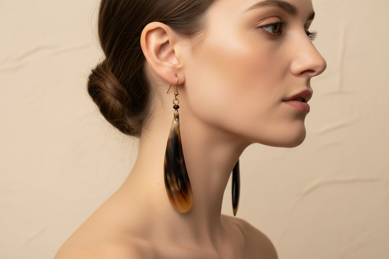 Finished with antique-bronze hooks and minimalist detailing, these earrings move gently with the body, creating an elegant vertical line that flatters the neck and shoulders. Lightweight yet visually striking, they transition effortlessly from day to evening.