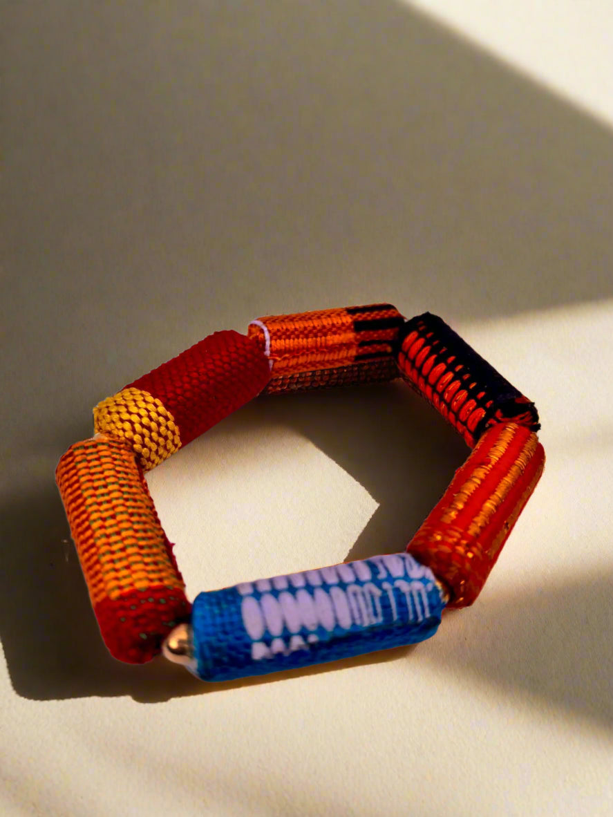 Each piece is handmade with authentic Kente cloth, carefully wrapped around tubular shapes to create a lightweight yet striking design. The vibrant patterns in red, gold, green, blue, and black reflect the richness of African tradition while offering a modern, wearable style.