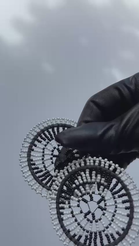 Make a bold yet elegant statement with these West African Black & White Beaded Earrings. Handcrafted with durable hard plastic beads, their circular hoop design and intricate monochrome patterns reflect the timeless artistry of African beadwork.