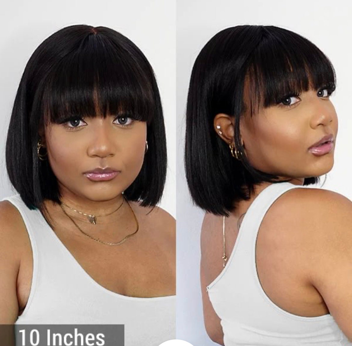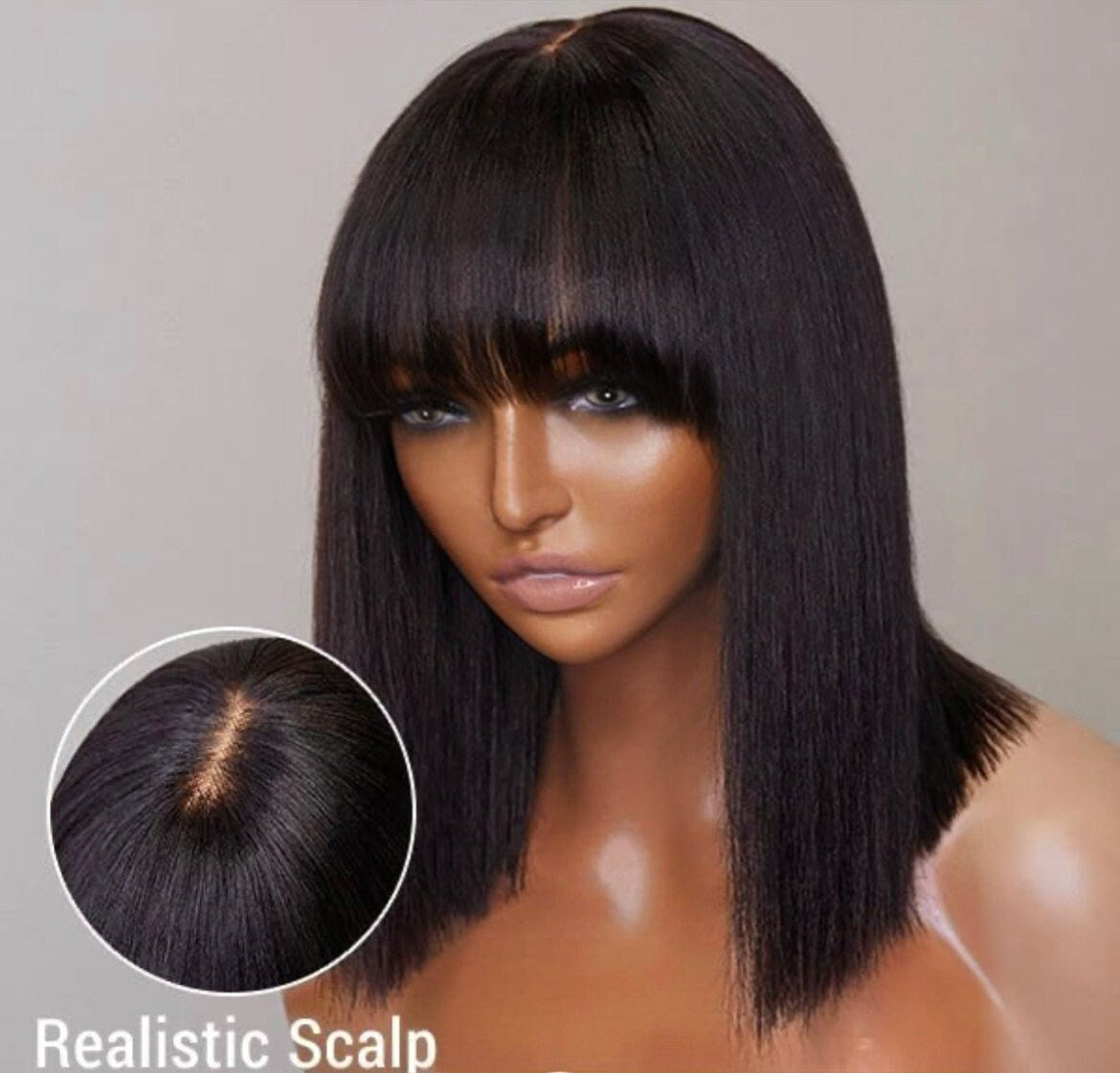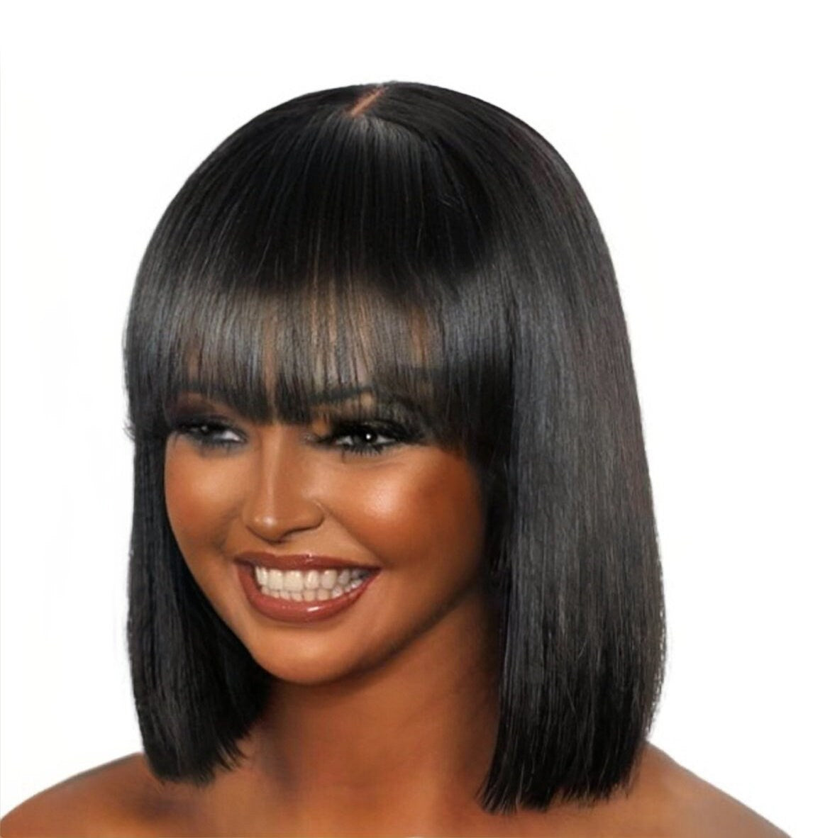 Realistische, lijmloze, yaki rechte bob met pony.