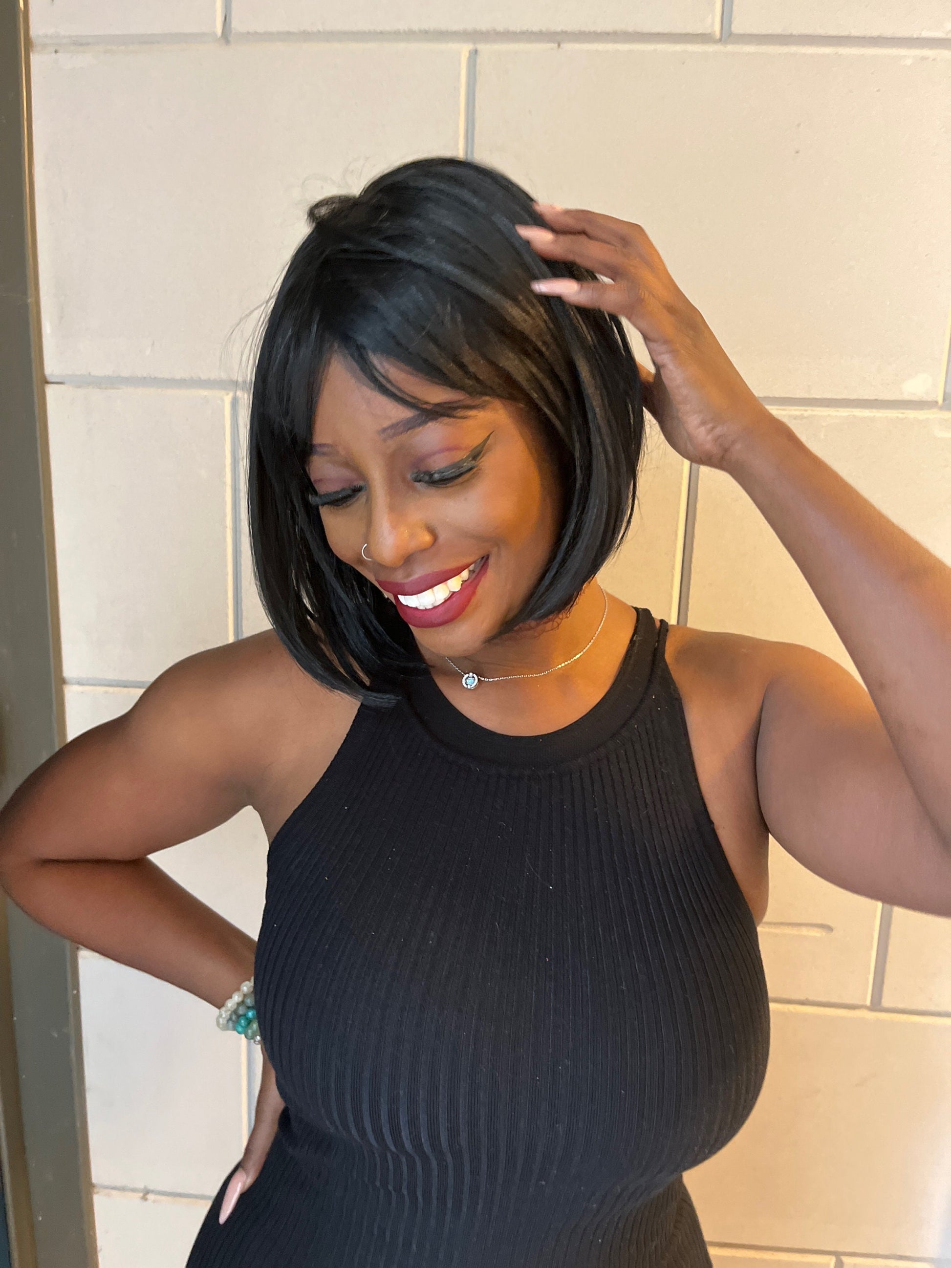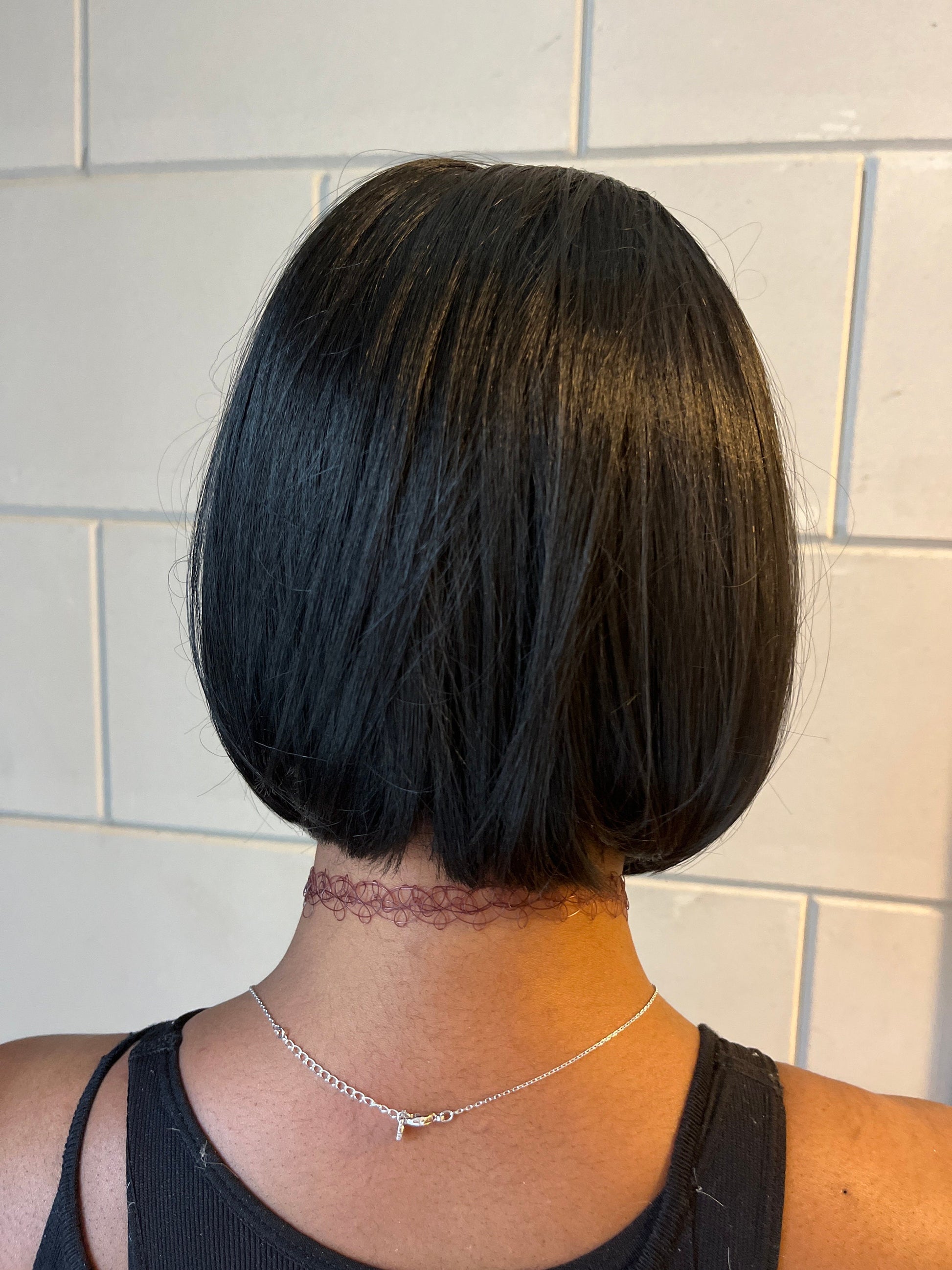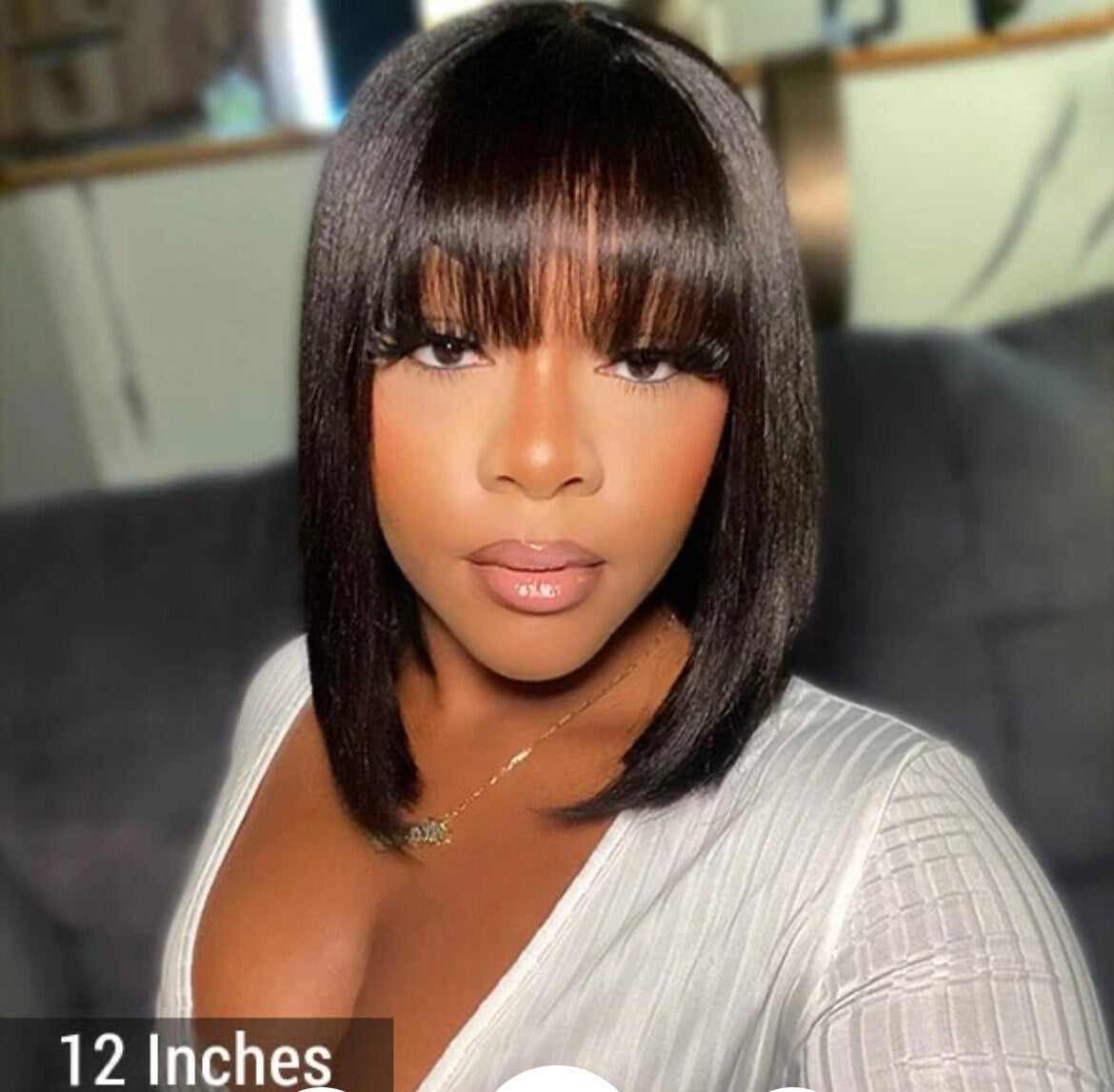 Realistische, lijmloze, yaki rechte bob met pony.